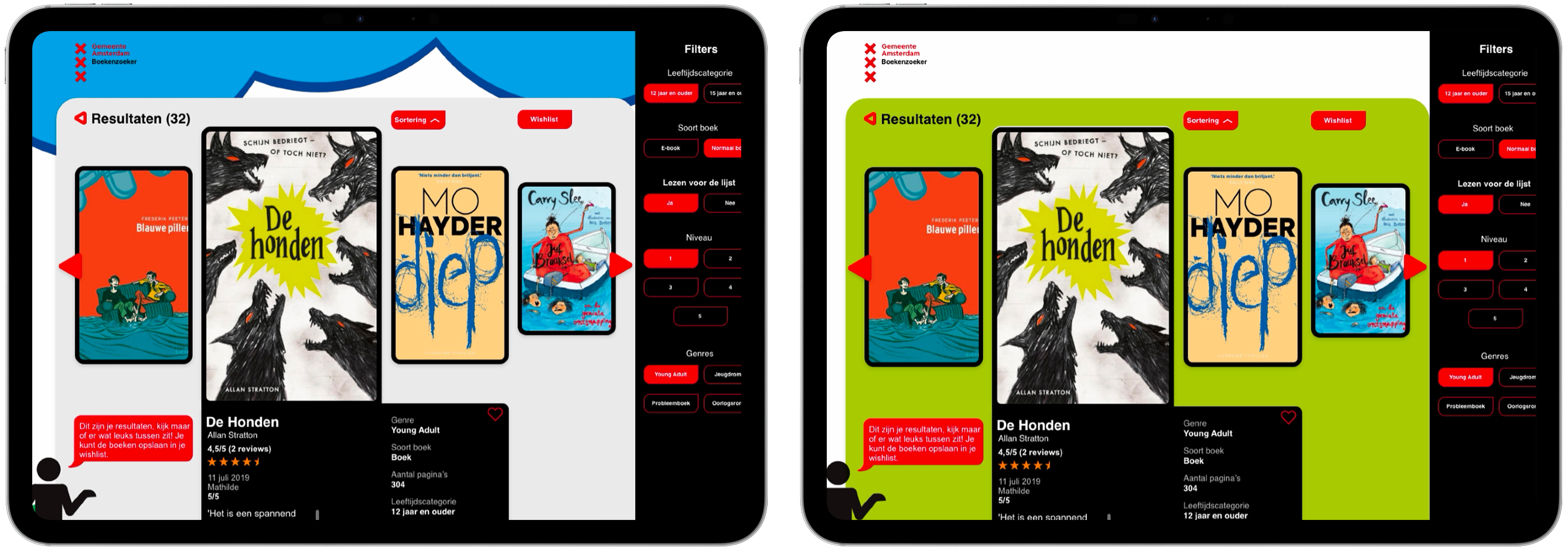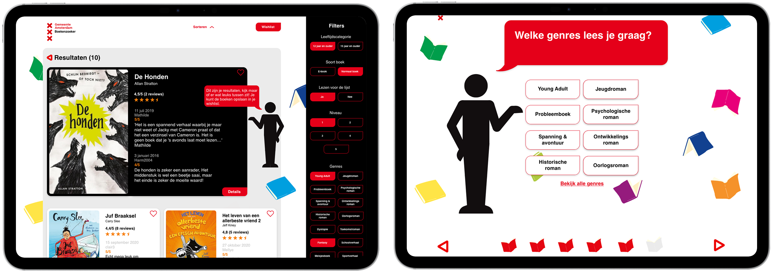 Om een eigen substijl binnen de huisstijl van de stad Amsterdam te ontwikkelen, heb ik boekillustraties ontworpen in de officiële merkkleuren en deze op de achtergrond geplaatst. Dit voegt visuele diepte toe, terwijl de interface speels blijft en herkenbaar is voor de doelgroep.